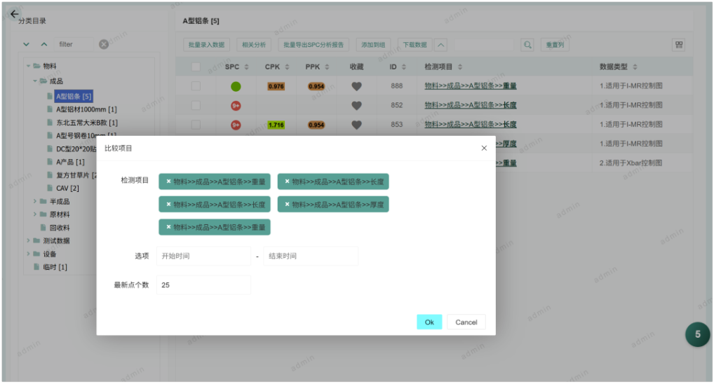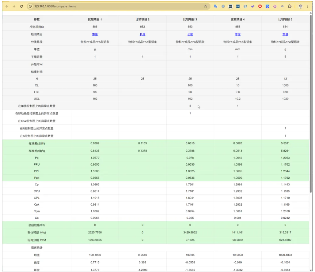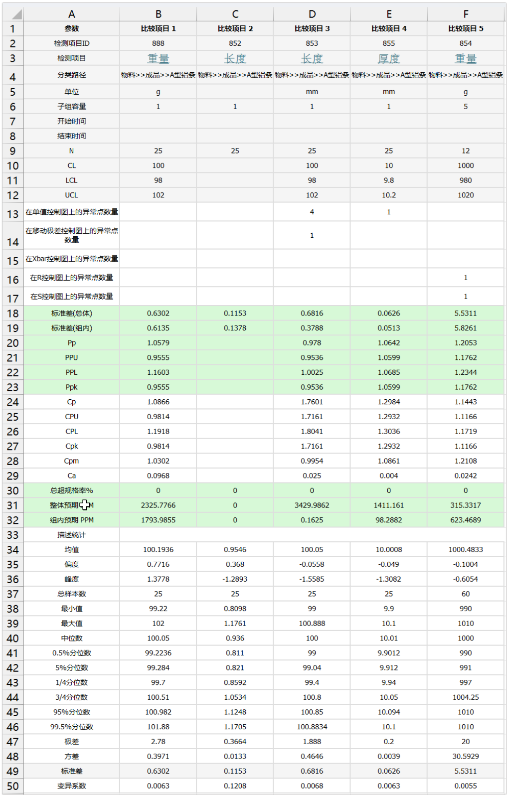 我们在做SPC分析的时候,经常要对同一个产品的所有检测项目做对比SPC分析,或者对同一类检测项目在不同的产品中做SPC分析。 在我们的SPC分析的检测项目列表中,你可以跨分类添加到组中。 点击组图标的菜单“比较项目”: 你可以统一用时间筛选,也可以统一用多少点来编制控制图得到统计结果。 如下图,显示了这五个检测项目的: