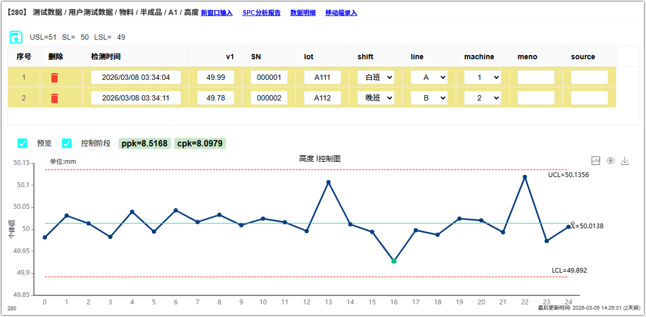 斌果SPC作为一款高度成熟的WEB SPC,从底层数据库架构上彻底抛弃了需要人工拼接追溯数据的单机版思维。不管是手工录入、excel导入或者接口同步,都预留足够的结构化字段来记录每一个检测值的属性元数据(如批号、班次、工位、人员、设备、模具、材料供应商等),这些都可以自定义。