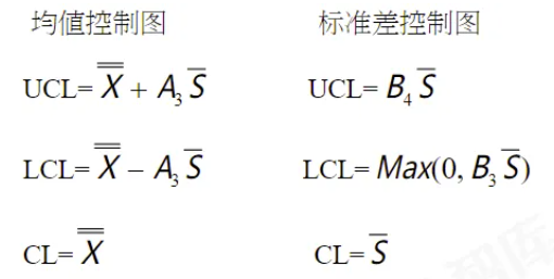 对于子组大小>10,我们需要使用Xbar-S控制图,Xbar控制图和S控制图的控制限计算如下: