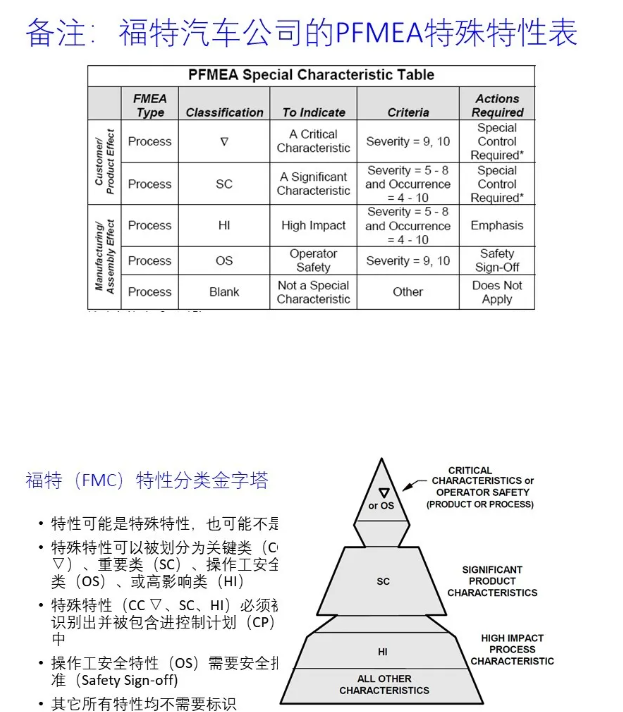 在以上表格,DFMEA和PFMEA都共同识别为重要特性,标识为SC,还是Hi?――标识为SC,因为DFMEA识别出潜的重要特性,传递给PFMEA,严重度具有传递性,PFMEA重新评价发生度,如果也是4-10分,那么就是SC。也就是SC为DFMEA和PFMEA共同识别出来的重要特性。