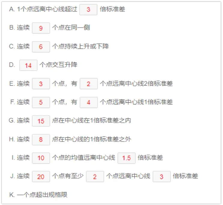 比如1个点远离中心线3倍标准差,也可以改为2.5倍 4倍等等。