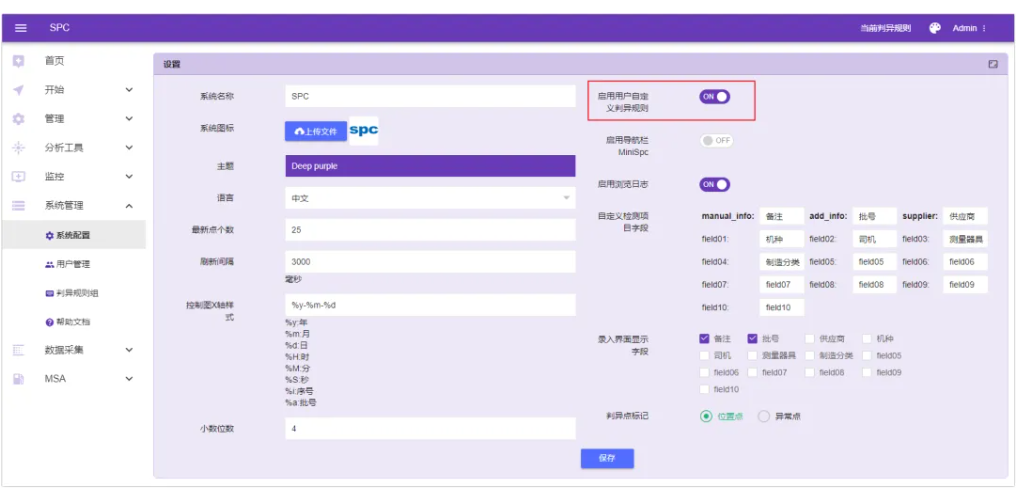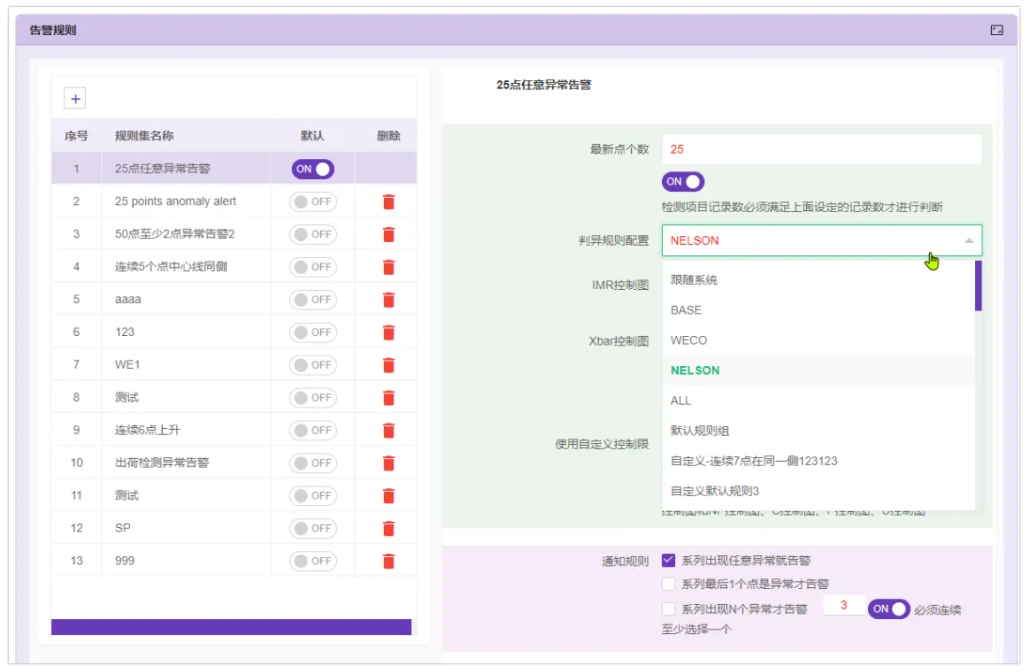 SPC监控中,每个监控规则都可以绑定系统<判异规则组>,默认生效的监控规则就可以指定使用什么<判异规则组>来判异。