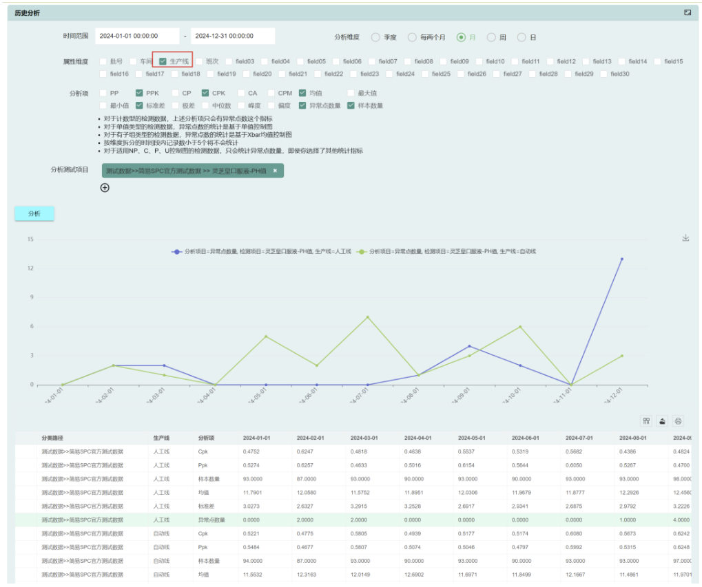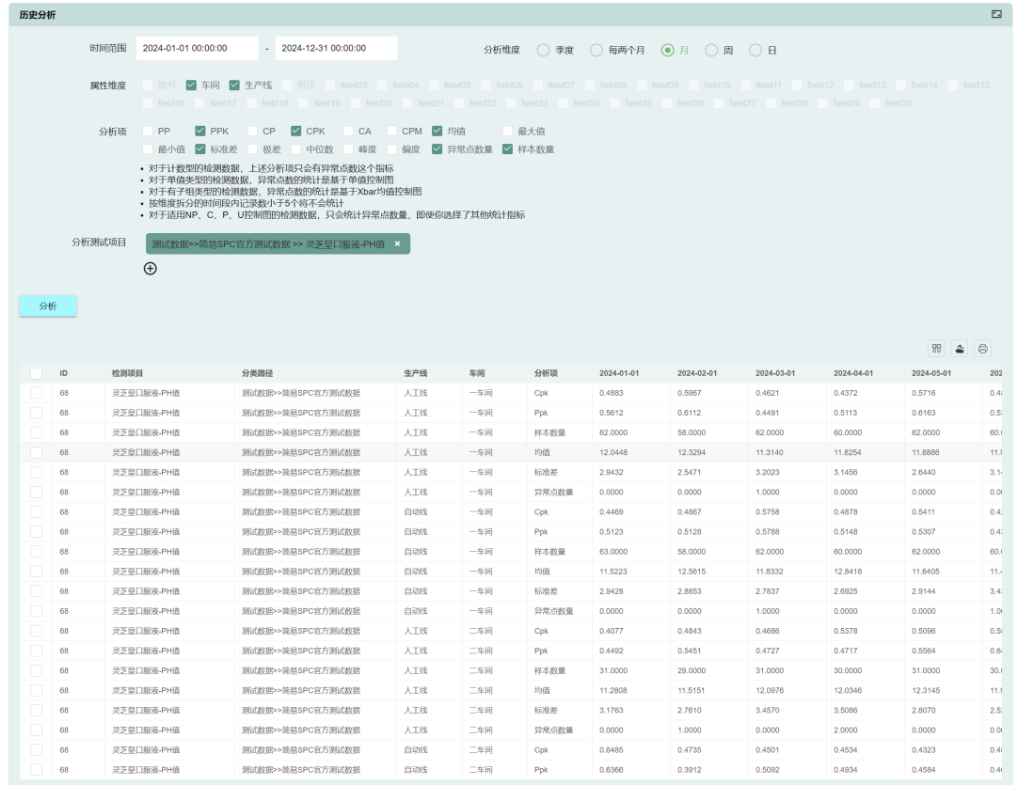 只要检测的数据有属性区分(如上述的车间、生产线类型),可以区分属性批量进行历史分析