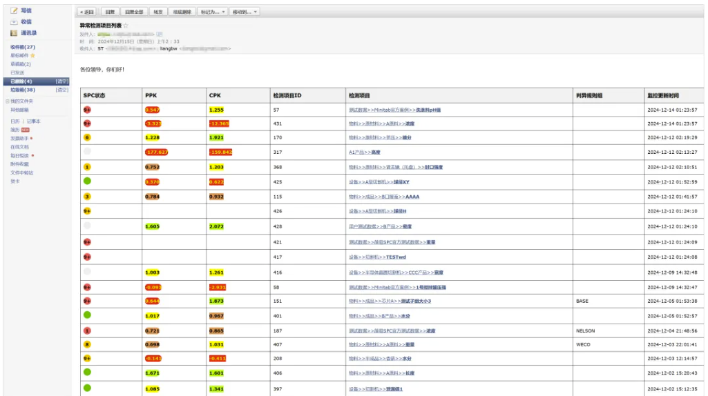当检测项目有数据修改、新数据插入,就会自动按照配置的规则来判断控制图是否有异常(红点),CPK和PPK能力是否不足,可以在系统中查看到异常清单