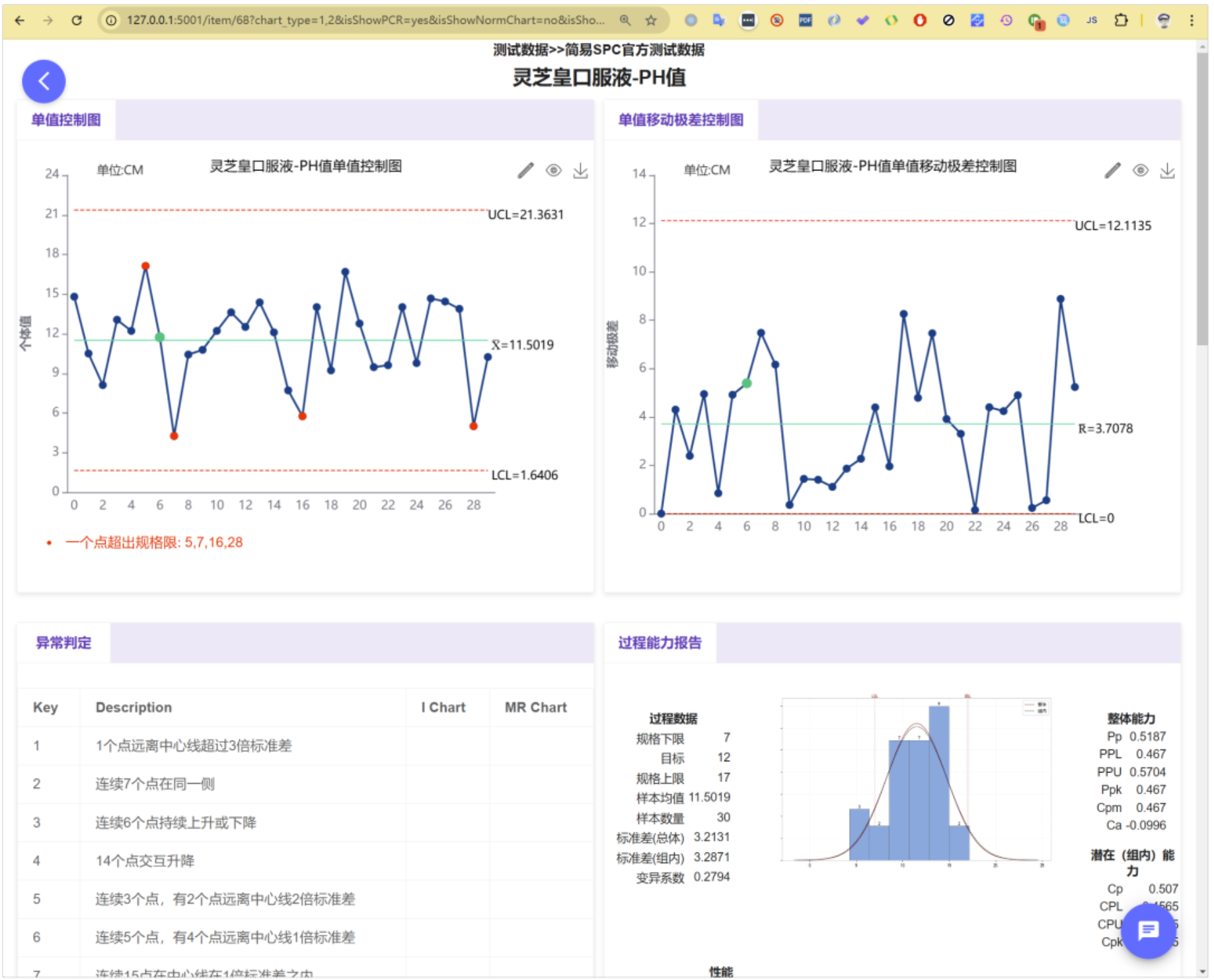 从中可以看到,一些数据点已经超出了规格限,特别是“一个点超出规格限”的位置在数据点序号5、7、16、28出现。