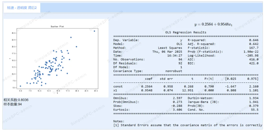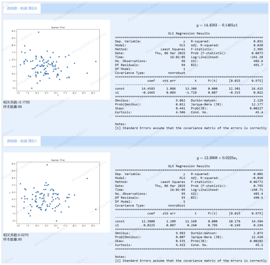 转速(滞后2期,即N-2期)和透明度(N期)存在明显的正相关,相关系数0.8,线性回归系数0.95,也就是说转速增加1,透明度会增加0.95左右。