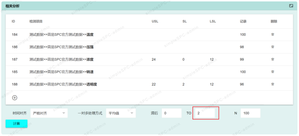 这些检测数据都已经采集到了SPC系统,我们直接选择罐子的温度、转速、压强和产出品的透明度和浓度,就可以批量做相关和回归了。你也可以选择其他的可能相关的检测项目来做。